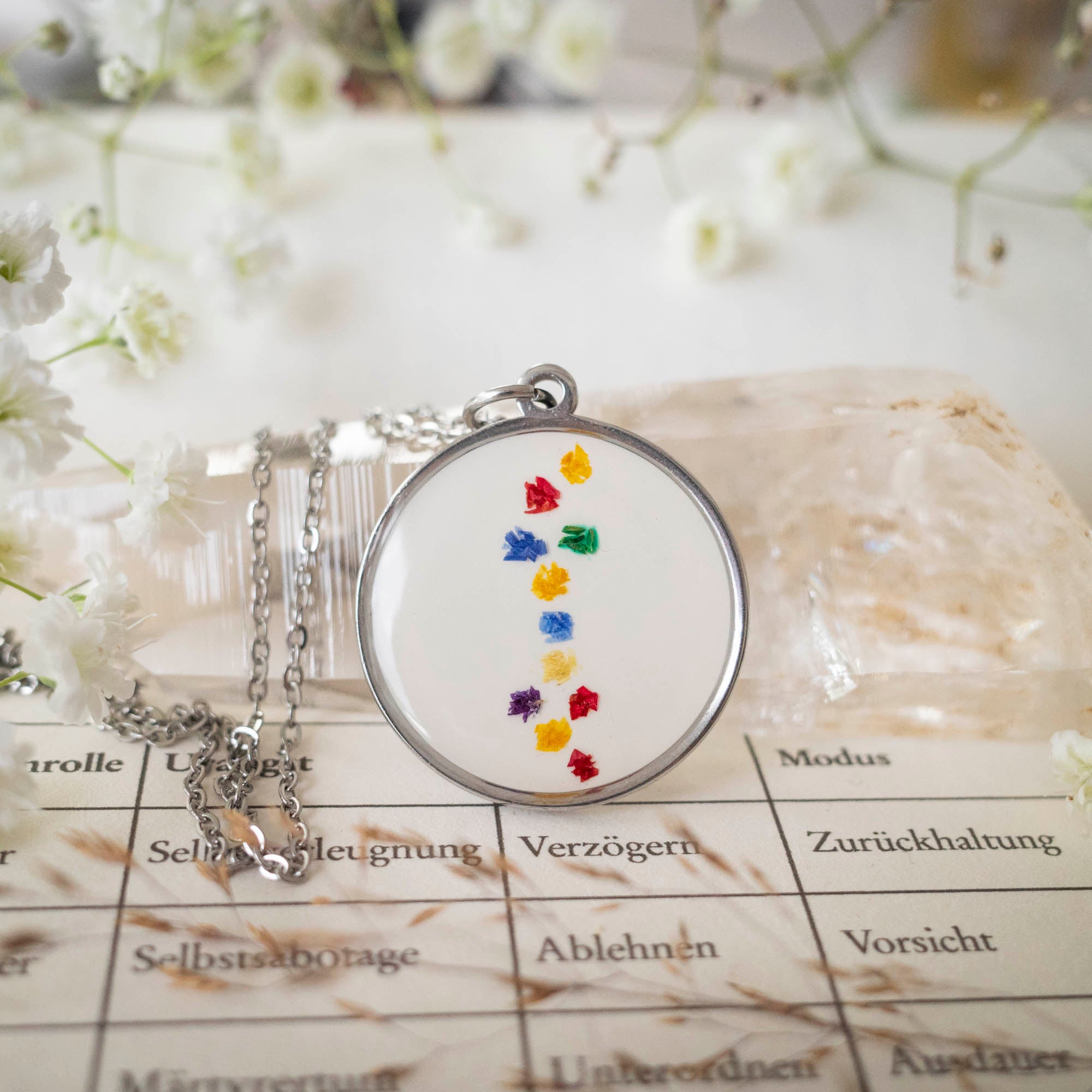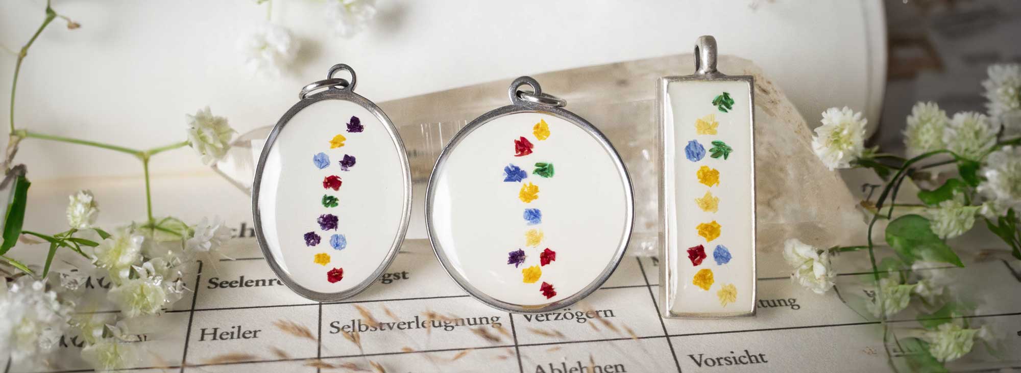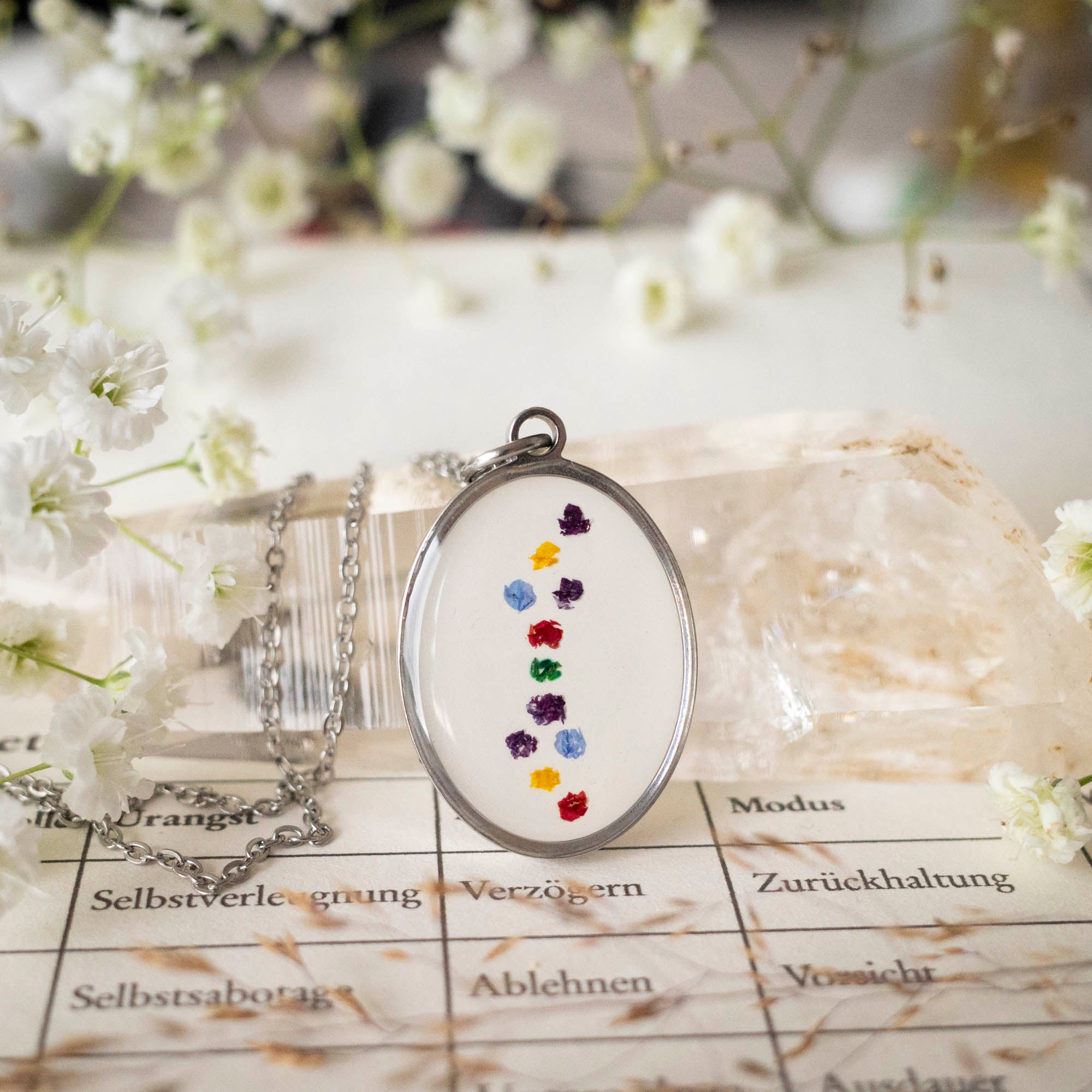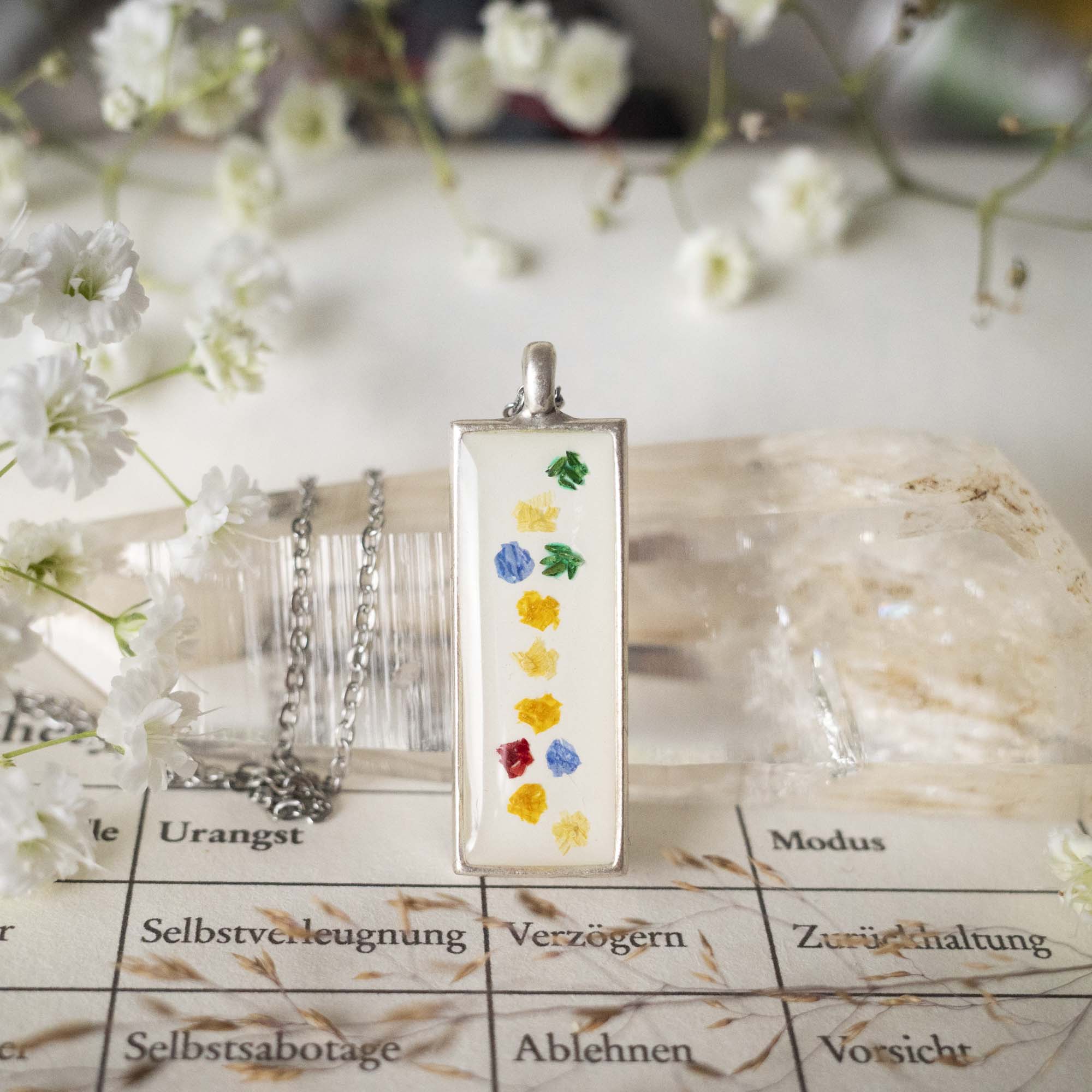 Aus Edelstahl gefertigt, mit echten Blüten in den Farben deiner Seelenmatrix. Schlicht, stabil und zeitlos. Preis: 64,90€ (inkl. Kette)