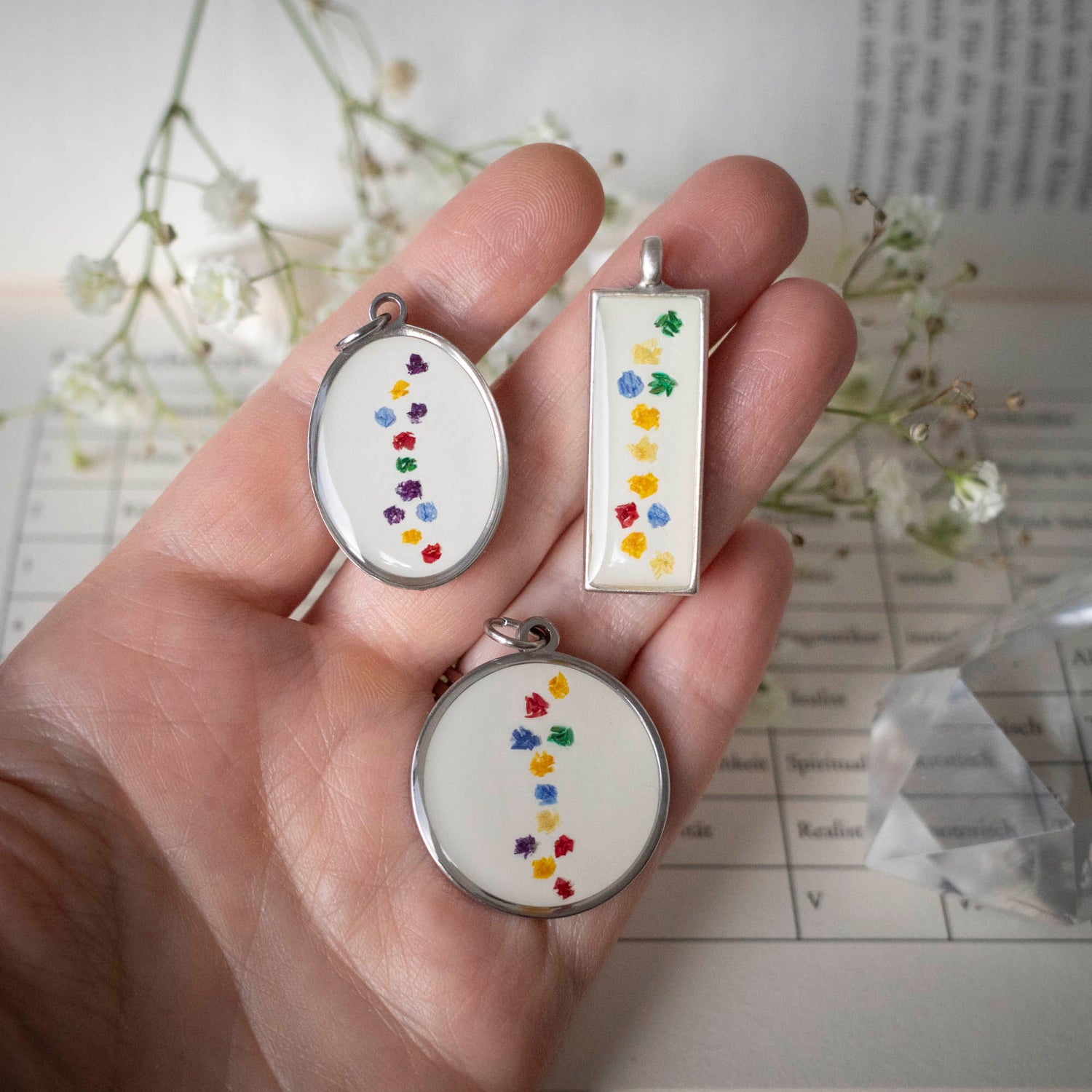 Als ich meine eigene Matrix von Marion Lockert, Coach für Sinn und Wandel, erstellen ließ, entstand gemeinsam mit ihr die Idee zu diesem Schmuck: die seelische Struktur in Farben und Pflanzen sichtbar zu machen.