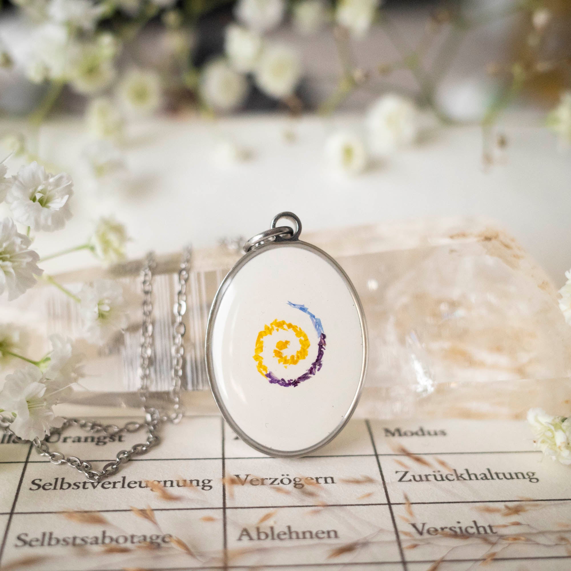 Aus Edelstahl gefertigt, mit echten Blüten in den Farben deiner Seelenmatrix. Schlicht, stabil und zeitlos. Preis: 64,90€ (inkl. Kette)