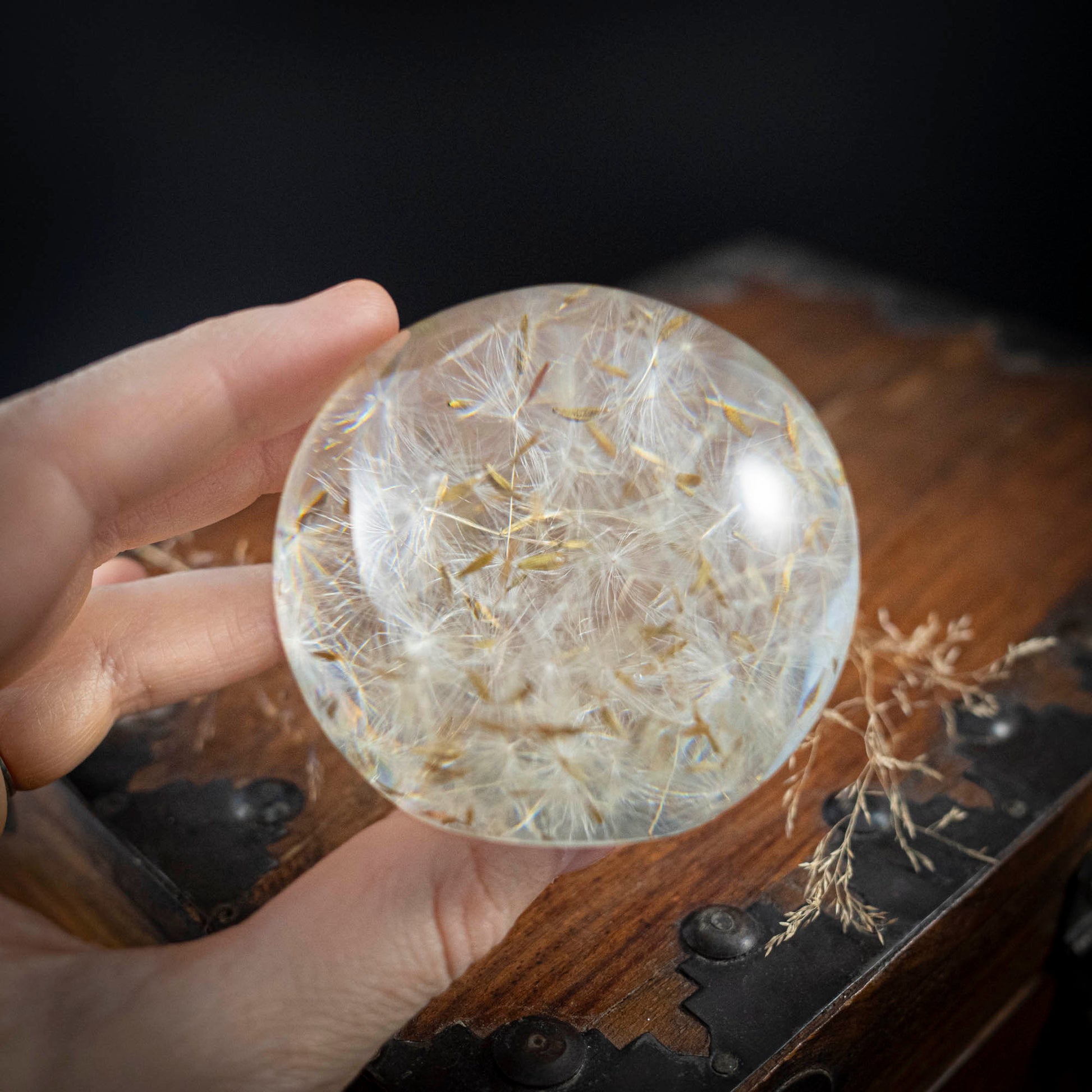 In dieser glasklaren Kugel aus Harz schweben echte Pusteblumensamen wie eingefangene Wünsche. Jeder Same erzählt vom Wind, vom Loslassen und von leisen Hoffnungen.