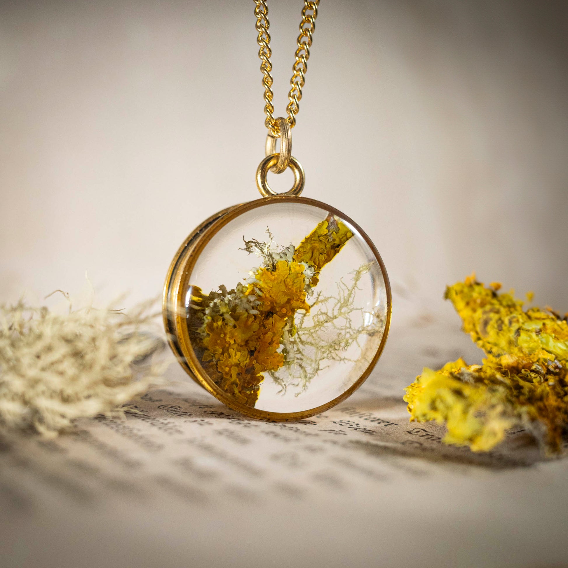 Dieser runde Anhänger bewahrt einen kleinen, flechtenbesetzten Ast. Eingefasst in klares Harz wie in einer lichtdurchfluteten Zeitkapsel. Ein stiller Schatz aus dem Wald. Gefunden, um bewahrt zu werden.