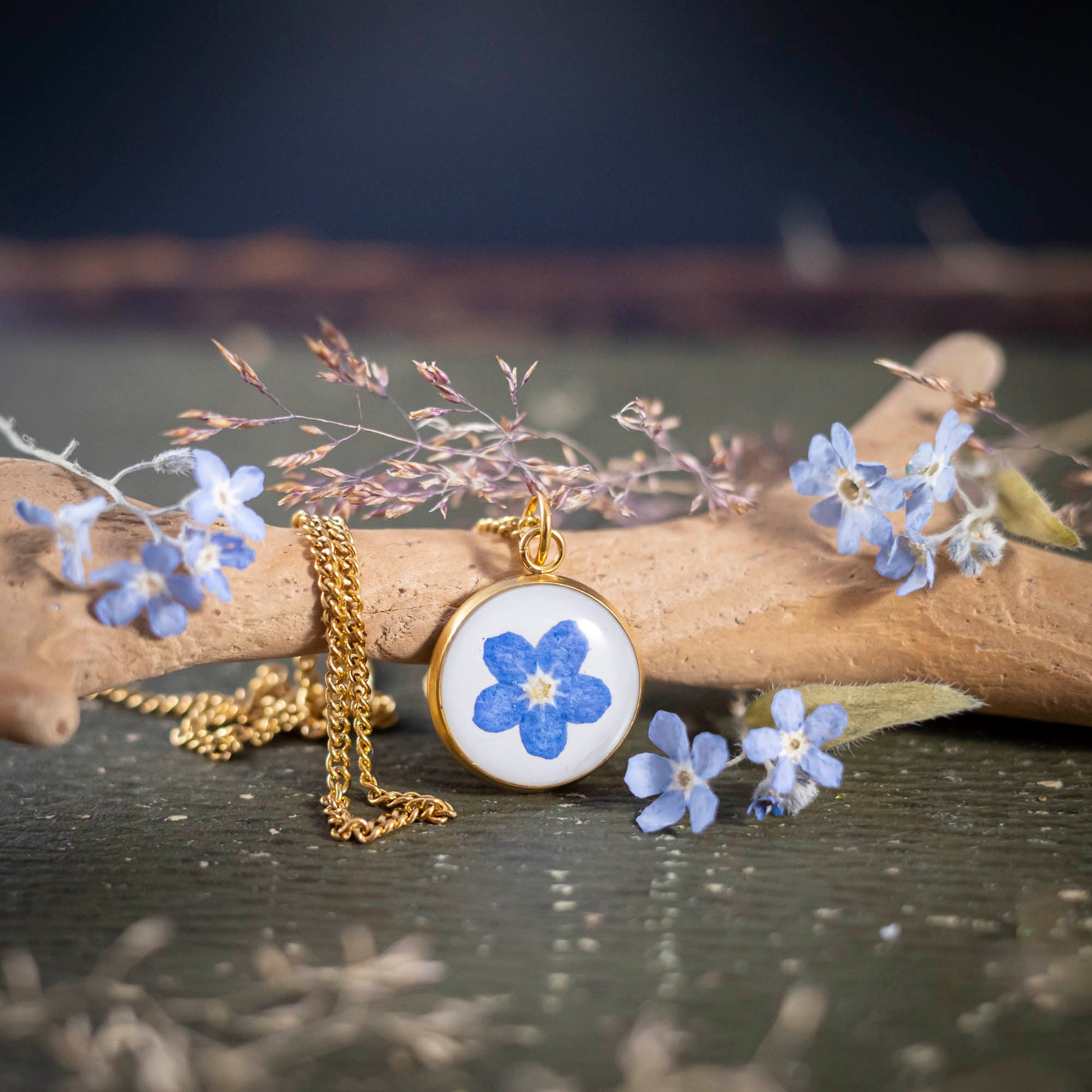 Hinweis: da es sich um ein Naturprodukt handelt, kann der Blauton der Blüten deines Schmuckstücks mal heller oder dunkler als hier abgebildet sein.