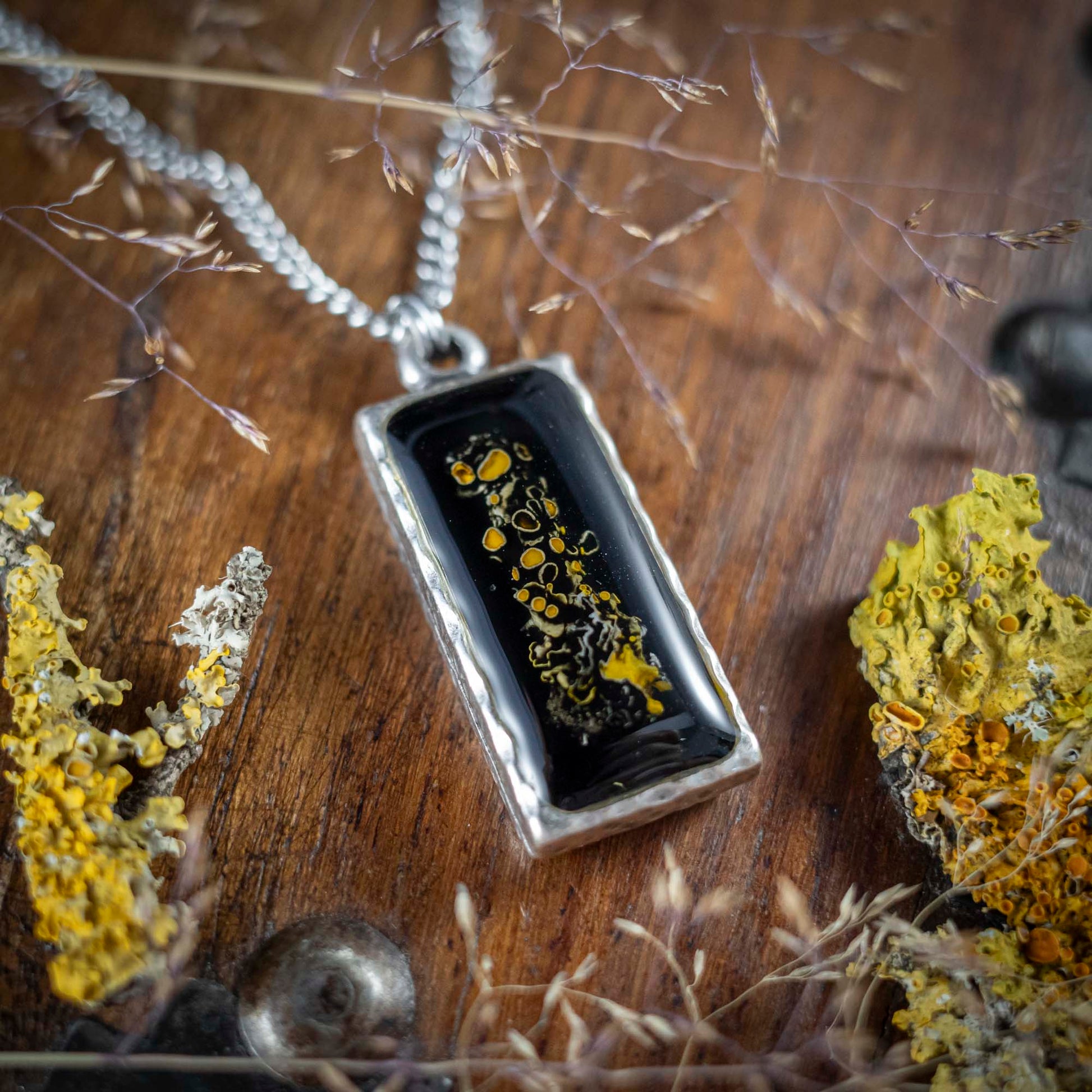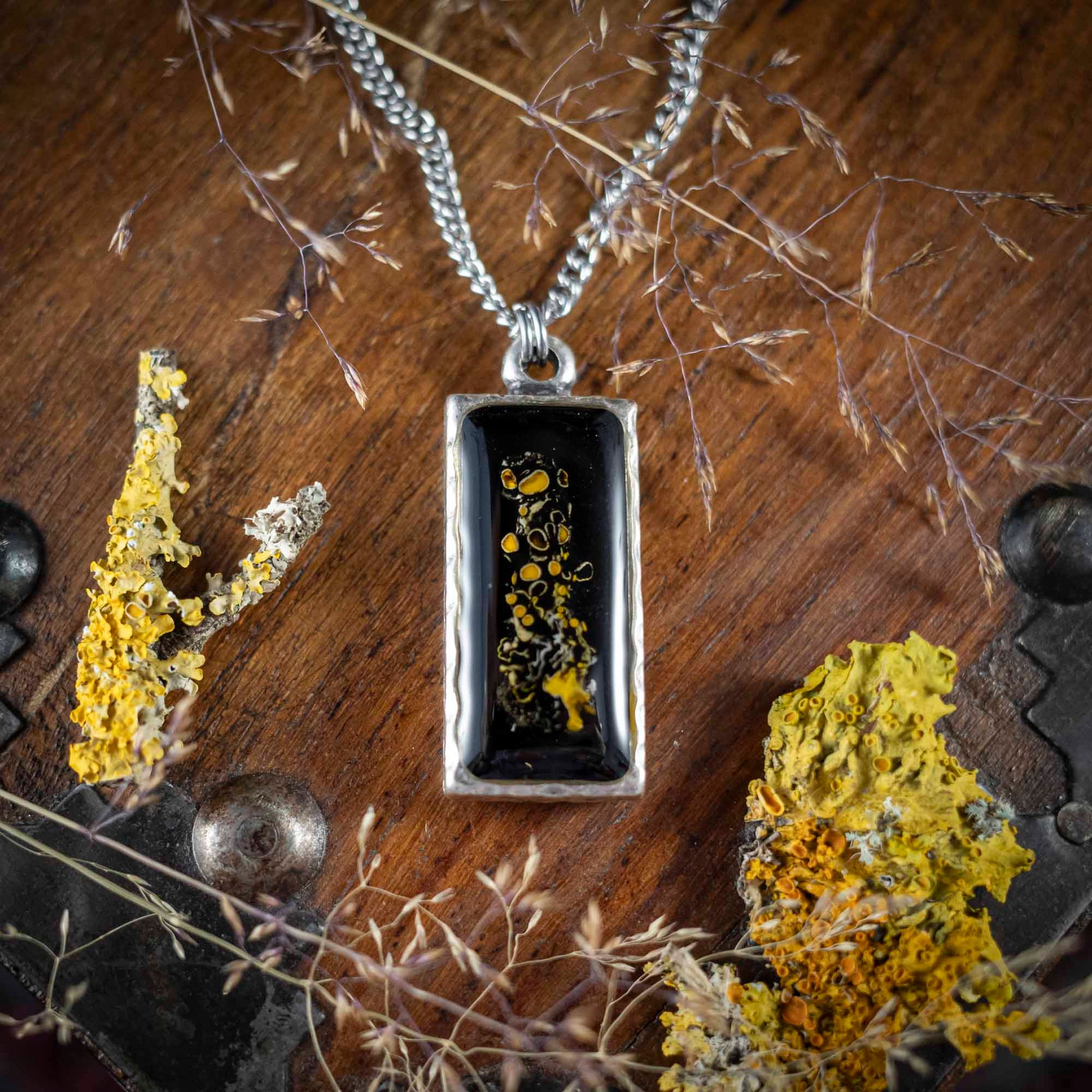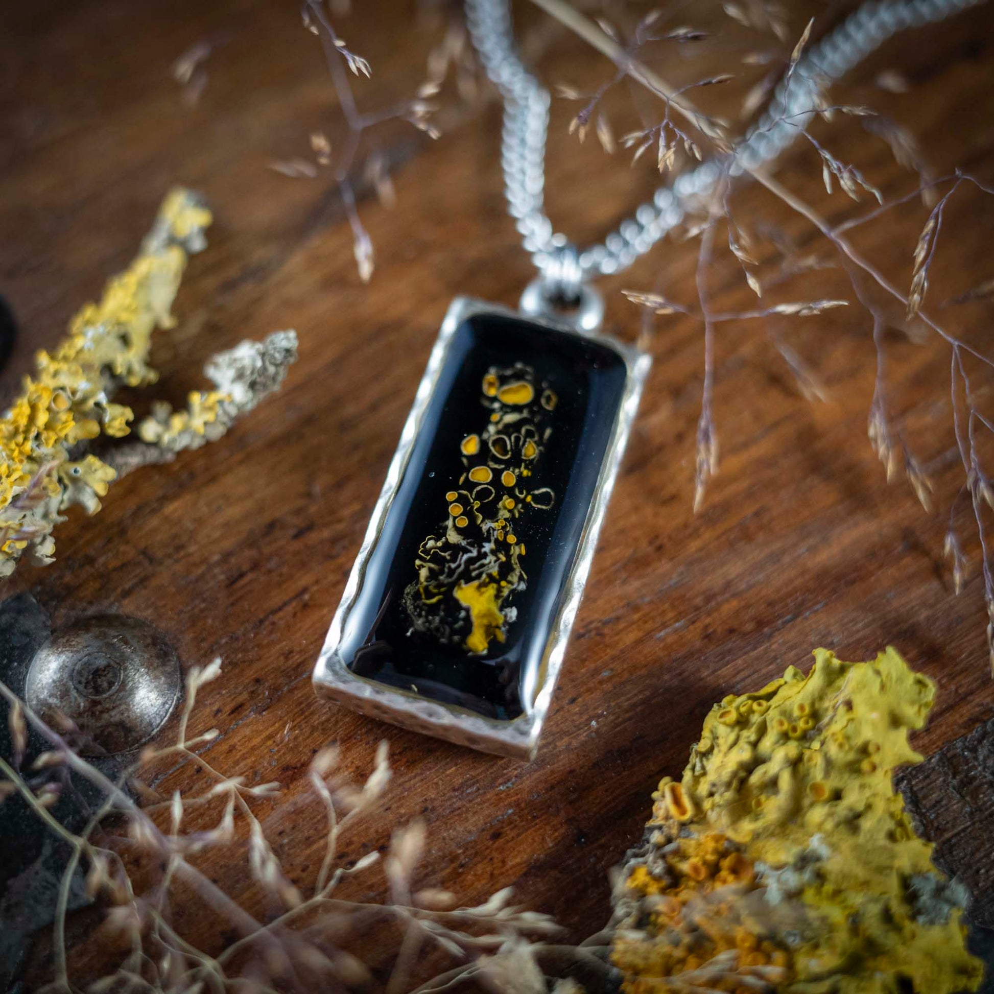 Waldleuchten - Anhänger mit gelber Flechte, rechteckig versilbert