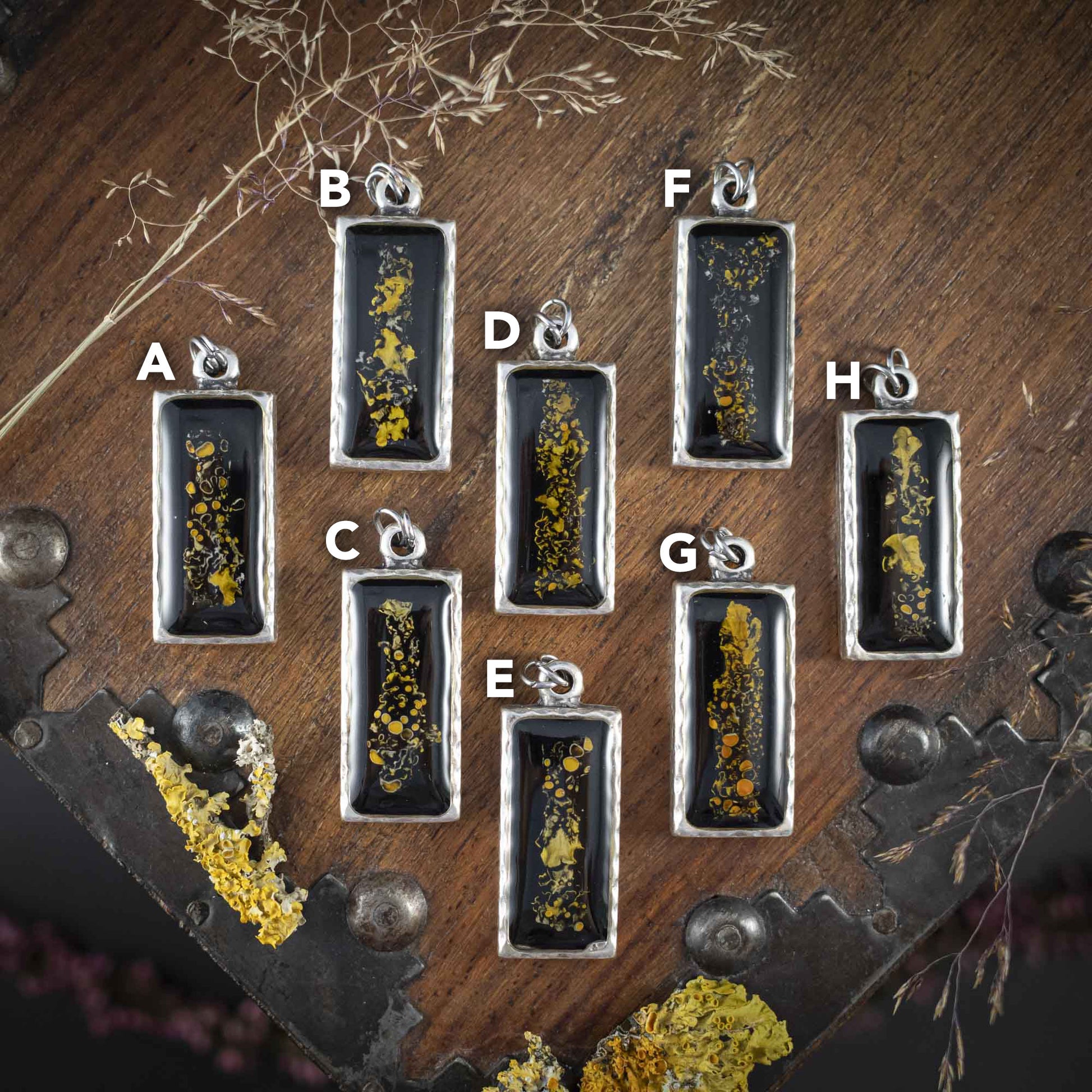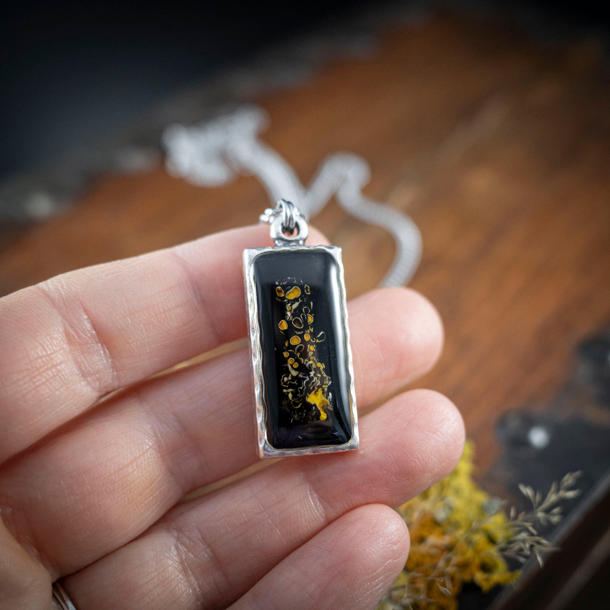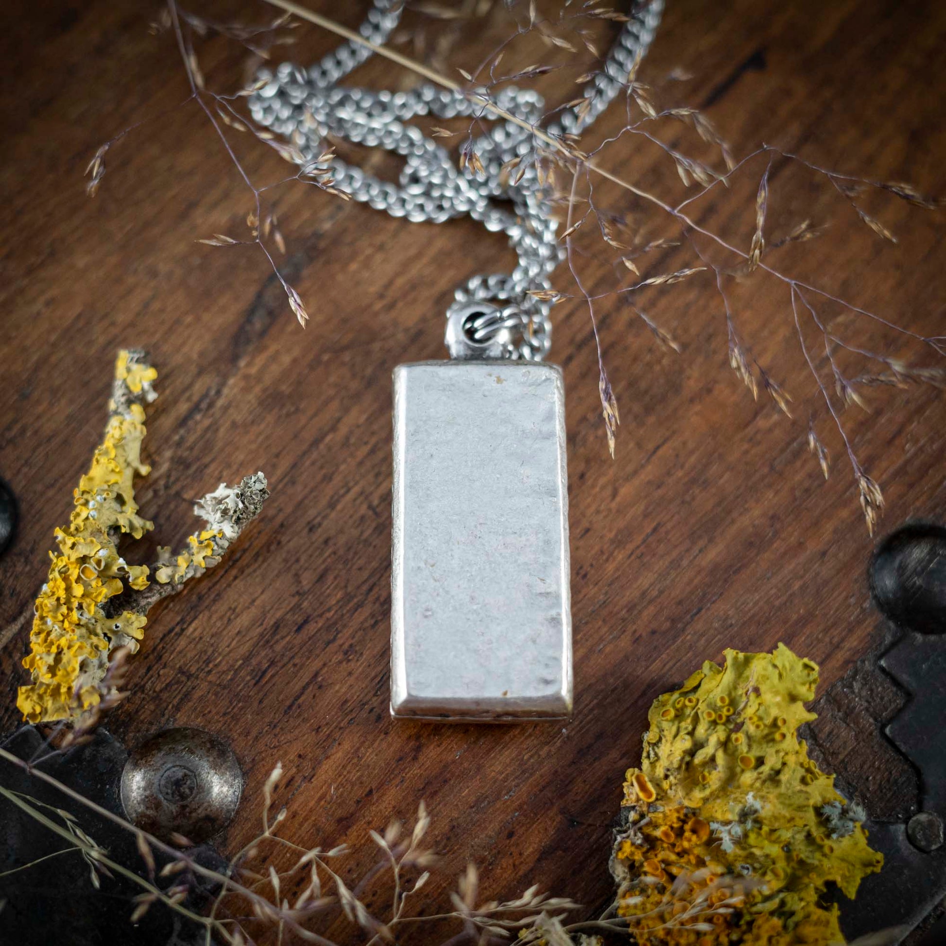 Waldleuchten - Anhänger mit gelber Flechte, rechteckig versilbert