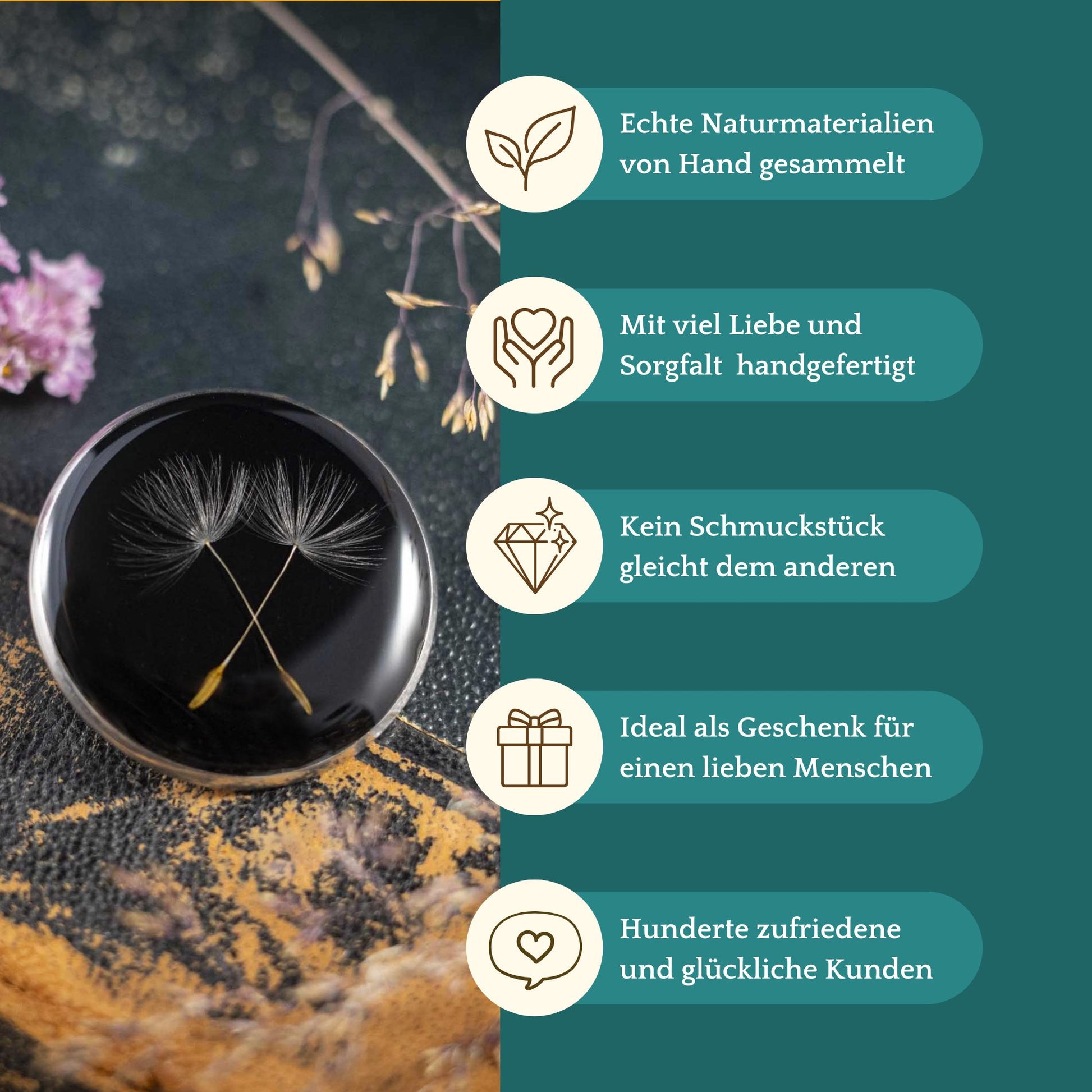 Jedes Stück erzählt seine eigene Geschichte und bewahrt ein echtes Stück Natur, das du immer bei dir tragen kannst. Entdecke die Wunder der Natur in meinen Kreationen.