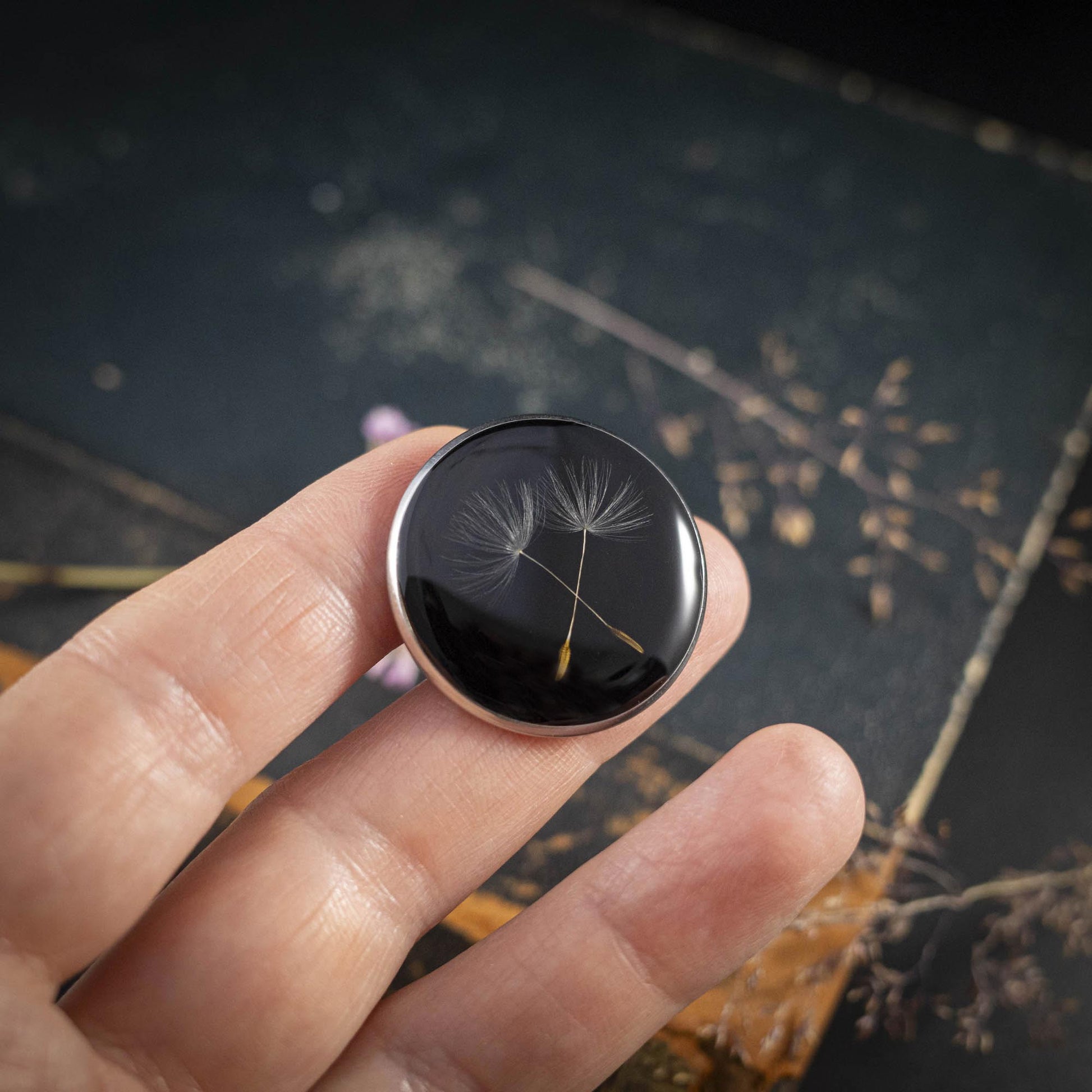 Zwei feine Pusteblumensamen schweben in dieser Brosche: Sinnbild für Leichtigkeit, Neubeginn und die Kraft der Wünsche. Jeder Samen trägt die Symbolik, dass ein kleiner Gedanke oder Traum hinaus in die Welt getragen wird, um sich zu entfalten. Ein zartes Schmuckstück, das Hoffnung und Verbundenheit ausdrückt.