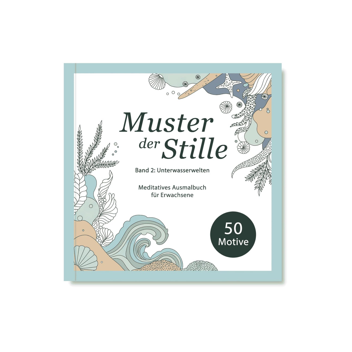 Ein meditatives Malbuch für Erwachsene, die kreative Ruhe und achtsames Ausmalen schätzen: von Korallenriffen und Fischschwärmen über verlassene Schiffswracks bis hin zu ornamentalen Algenwäldern.